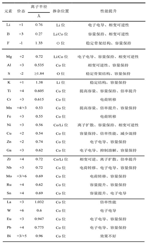 而這方面,無(wú)論是NCA還是NCM811,其實(shí)都是相似的。不過(guò),既然是NCA,其中的Al還是對體相的結構穩定性起到了一定的作用,這也是為什么NCA能在鎳比例方面比NCM走得更遠的原因。中科院物理所2018年的一篇博士學(xué)位論文中介紹了關(guān)于鈷酸鋰中常使用的摻雜和包覆元素性質(zhì)及作用匯總,這對于三元類(lèi)的材料也有非常大的參考價(jià)值。